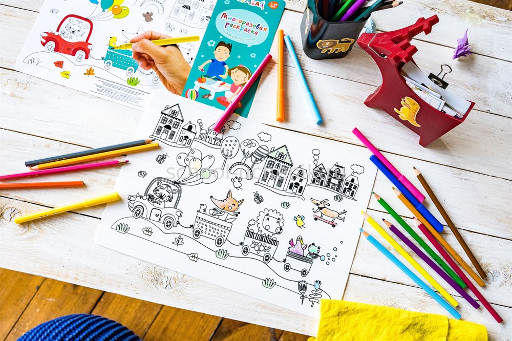 Веселые звери отправляются в путешествие! По дороге они проезжают мимо необычного города. Как он будет выглядеть — решать только ребенку. Подарите ему этот замечательный многоразовый коврик-раскраску для творчества, и он обязательно полюбит рисование. На поверхность уже нанесены контуры будущего изображения, которое нужно только раскрасить фломастерами или карандашами. Причем краску можно в любой момент стереть и начать рисовать снова.