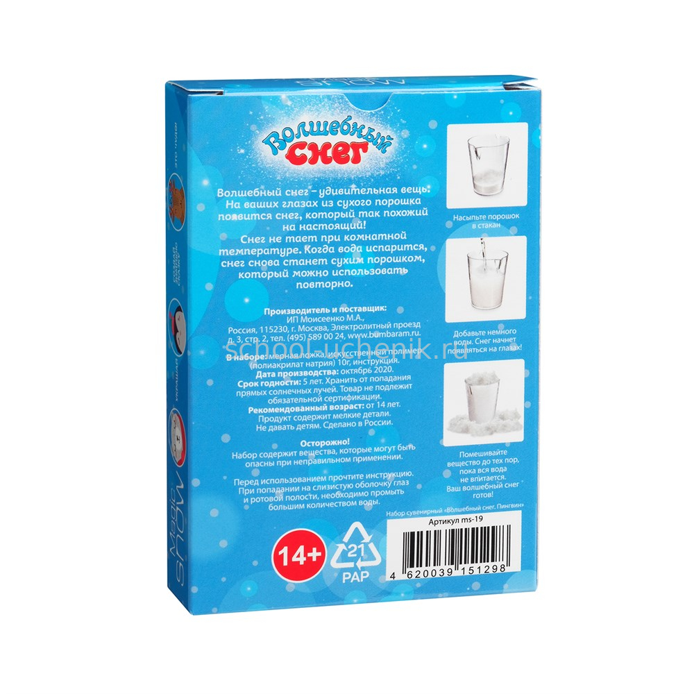 В набор входит: ложечка для снега, 1 пакетик порошка 10 г, инструкция на русском языке