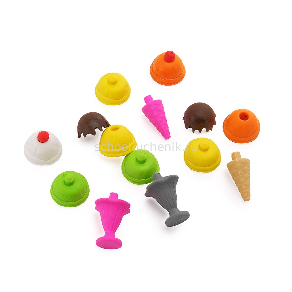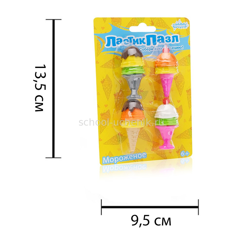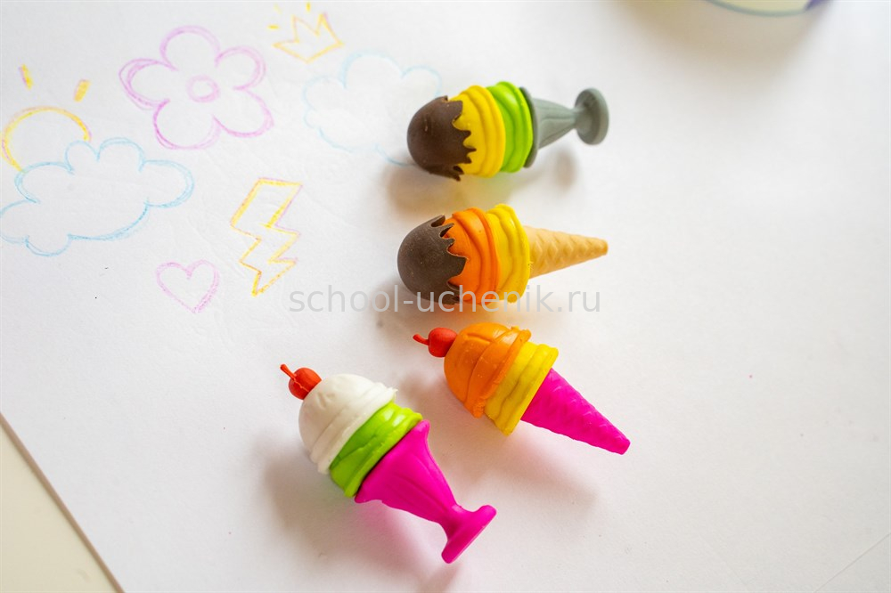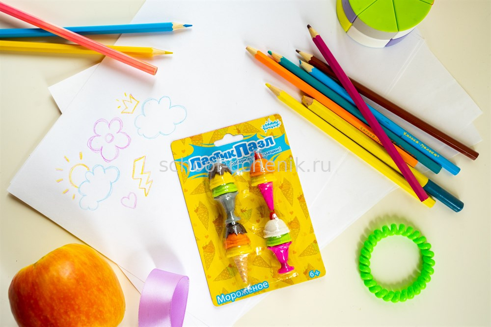 Разноцветные ластики-пазлы в виде мороженого поднимут настроение любому ребенку. Эта яркая школьная принадлежность привлекает к себе внимание и отлично подходит для занятий. Мягкая резина легко стирает карандашные линии, не оставляет цветов и расходуется очень экономно.