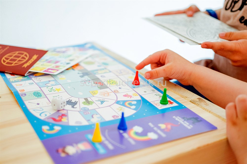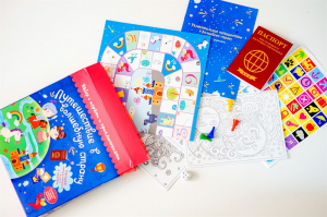 В комплекте: настольная игра-ходилка, фишки и кубик для игры, паспорт путешественника, книжка-инструкция с заданиями, наклейки, открытки-раскраски 3 шт.