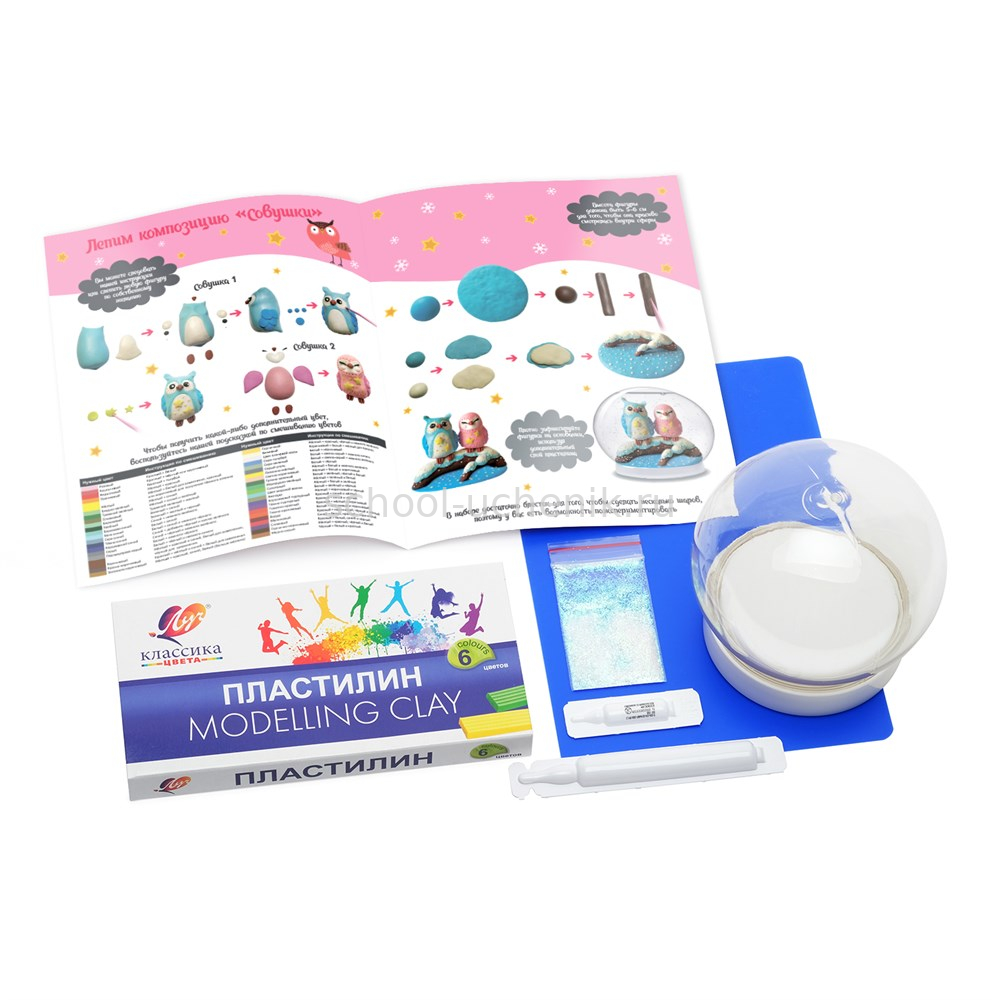 В наборе: подробная инструкция, сферическая основа для шара, цветной пластилин, доска для лепки, подставка для композиции, специальные жидкости, блестки для создания снежного эффекта.
