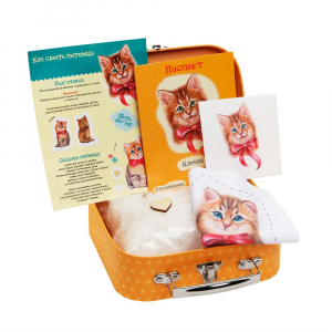 В ярком чемоданчике – набор для создания очень милого питомца. На ткань уже нанесено изображение, вам нужно только вырезать детали и сшить две половины фигурки. Не забудьте положить внутрь сердечко! После того, как котенок будет готов, надо заполнить паспорт питомца. Придумайте ему биографию и кличку, что он любит? Какой у него характер? И последний штрих: наклейте портрет вашего любимца на чемоданчик. Теперь вы сможете брать нового друга с собой везде!