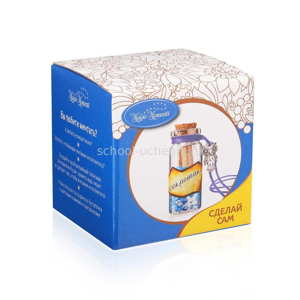 Это самый волшебный набор для творчества на свете! С помощью него вы сможете сделать талисман, который исполняет желания. В наборе уже есть все необходимое для создания декоративной бутылочки, которая может стать красивой подвеской или сувениром. Загадайте желание и дайте волю фантазии. Пусть ваш волшебный талисман будет самым ярким, а желания обязательно сбудутся.