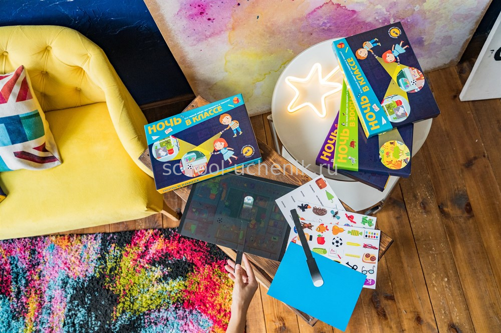 Ночь в классе – увлекательная настольная игра для детей и взрослых. Проведите захватывающую ночь в школе с настольной игрой из серии «Интересный мир»! В наборе вы найдете целых 100 карточек с предметами, специальное игровое поле с эффектом «темноты» и 2 фонарика из картона. «Подсвечивайте» игровое поле, чтобы опередить соперника и первым находить предметы в темноте. Кто первым отыщет аквариум? Кто быстрее рассмотрит все красные предметы в классе? А все предметы на букву «м» или круглой формы?