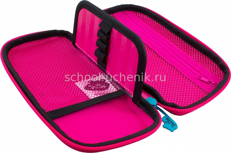 Пенал имеет одно большое отделение, разделенное перегородкой, на которой удобно можно разместить все ручки и карандаши, так же имеется удобное отделение-сеточка на молнии.