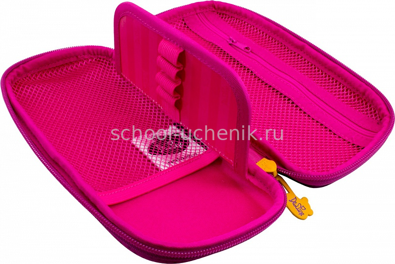 Пенал имеет одно большое отделение, разделенное перегородкой, на которой удобно можно разместить все ручки и карандаши, так же имеется удобное отделение-сеточка на молнии.
