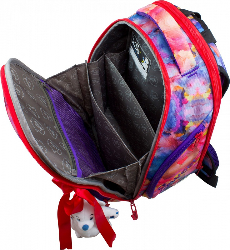 Ранец имеет 2 отделения. При открытии центрального отделения раздвигаются разделители (книжка), так же в нем находится карман-сеточка на молнии.