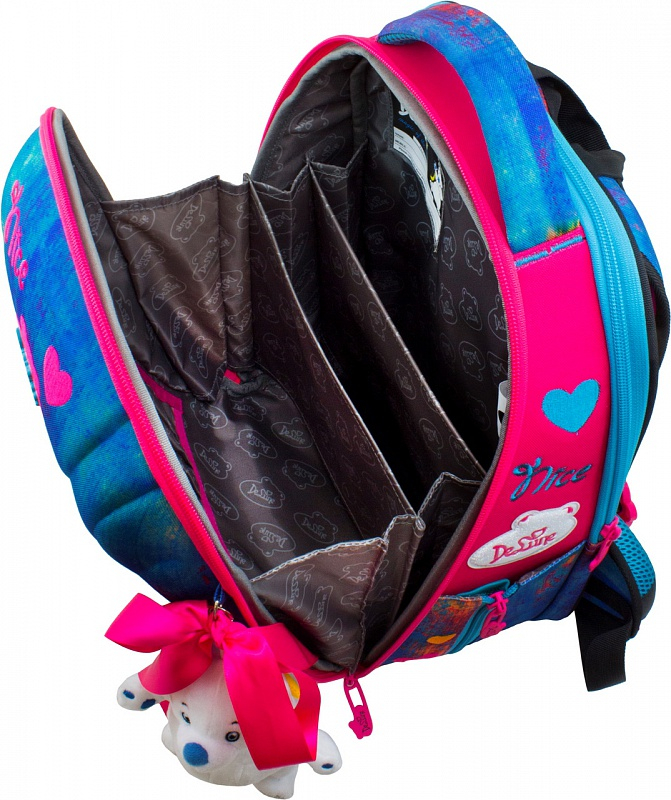 Ранец имеет 2 отделения. При открытии центрального отделения раздвигаются разделители (книжка). Внутри расположено отделение для письменных принадлежностей.