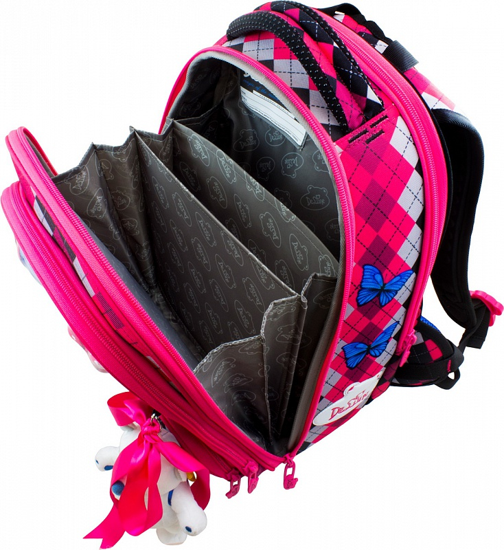 Ранец имеет 3 отделения и карман для пенала. При открытии центрального отделения раздвигаются разделители (книжка). В переднем отделении можно удобно разместить классические тетради и другие принадлежности для школы.