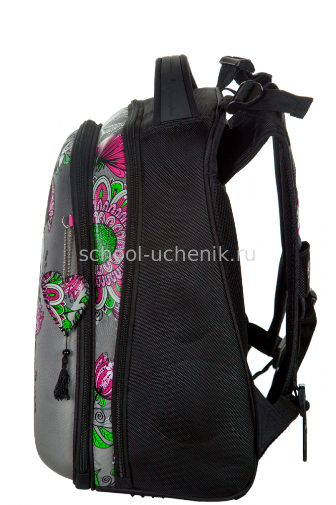 - три больших отделения на молниях. В основном, самом большом отделении расположены жесткие перемычки- вставки, для комфортного размещения тетрадей или учебников. В переднем отделении предусмотрен органайзер с карманом для мобильного телефона, сетчатым карманом для мелочей, отделениями для ручек и карандашей, подвеской для ключей.