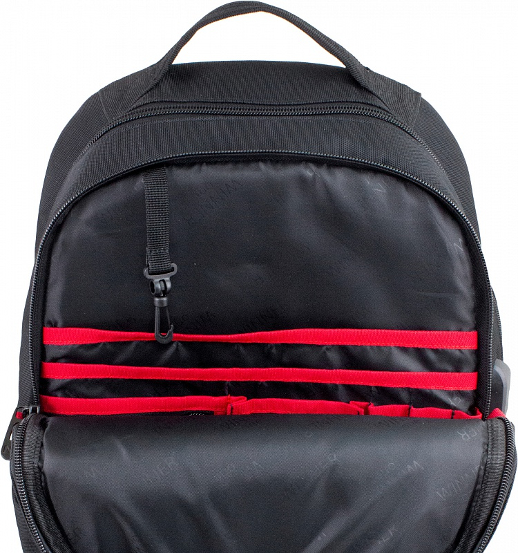 Во втором отделении органайзер для письменных принадлежностей, с карабином для ключей или пропуска.