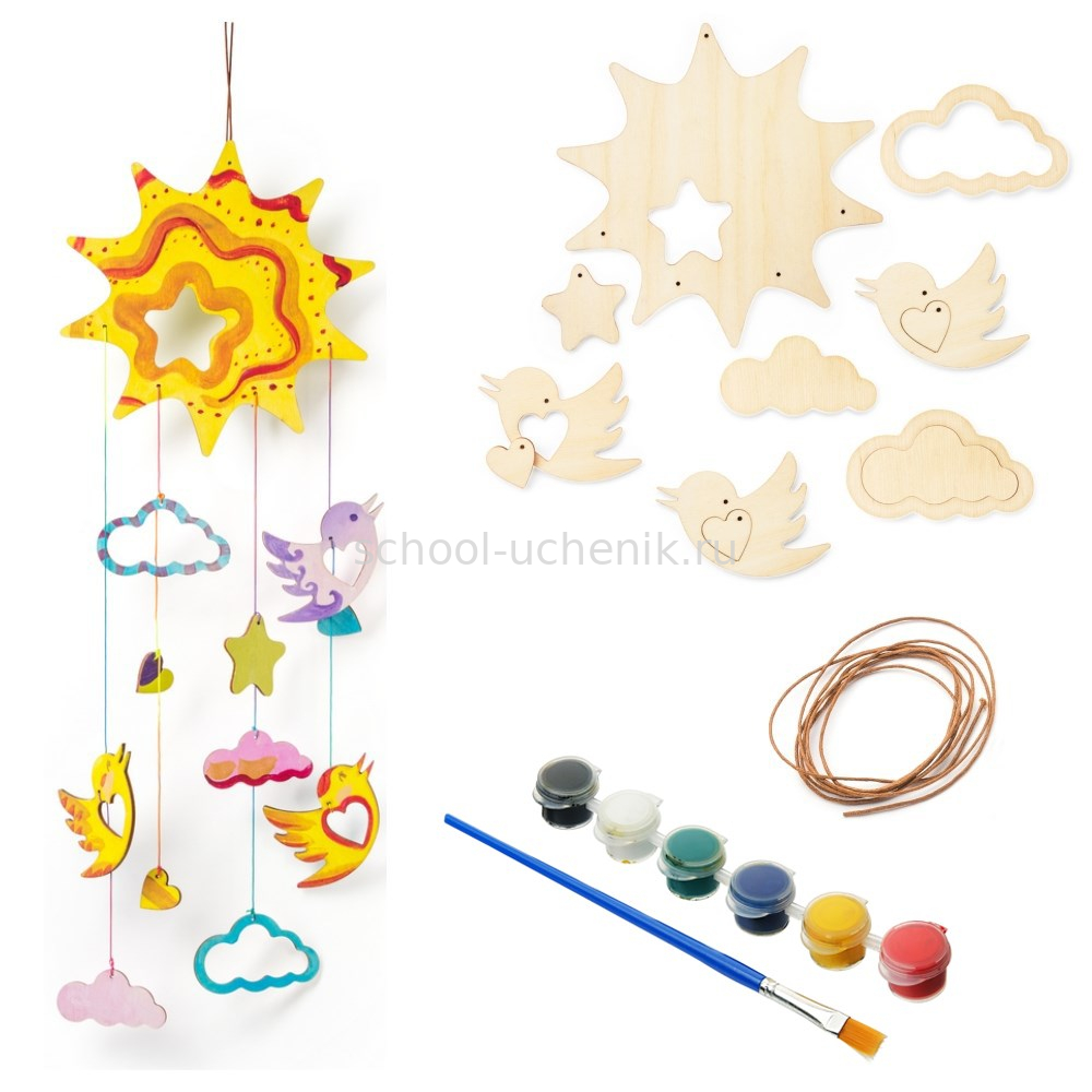 В наборе: деревянные заготовки для раскрашивания, краски и кисть, шнур для сборки подвески