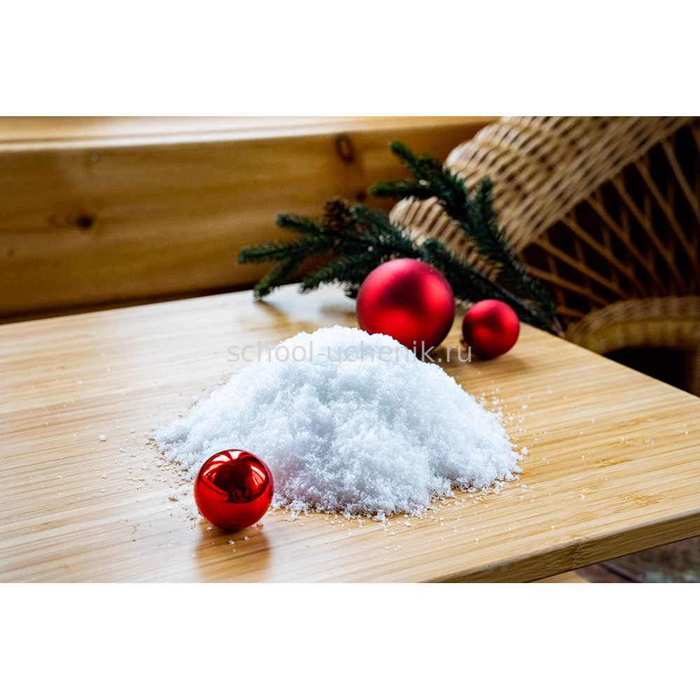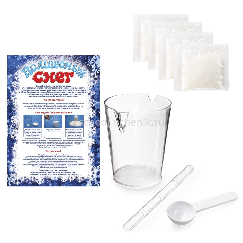 В наборе: снег 40 г, люминофор, пластиковый стакан, мерная ложка, палочка для размешивания, цветная инструкция на русском языке