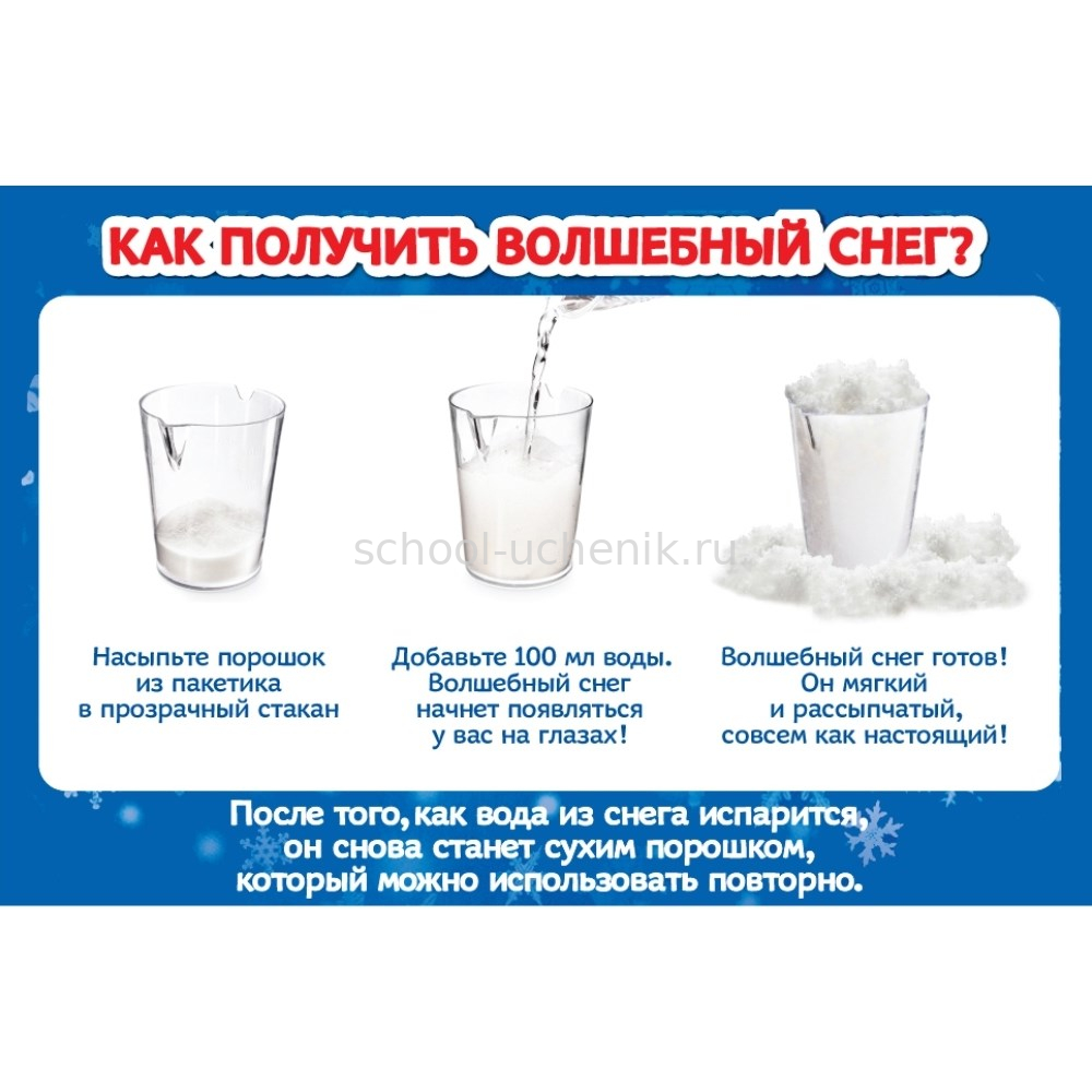 Волшебный снег можно использовать много раз: через несколько дней, после того, как влага из него испарится, снег снова превратится в порошок. Аккуратно соберите его в пластиковый пакет и сохраните для следующего использования.